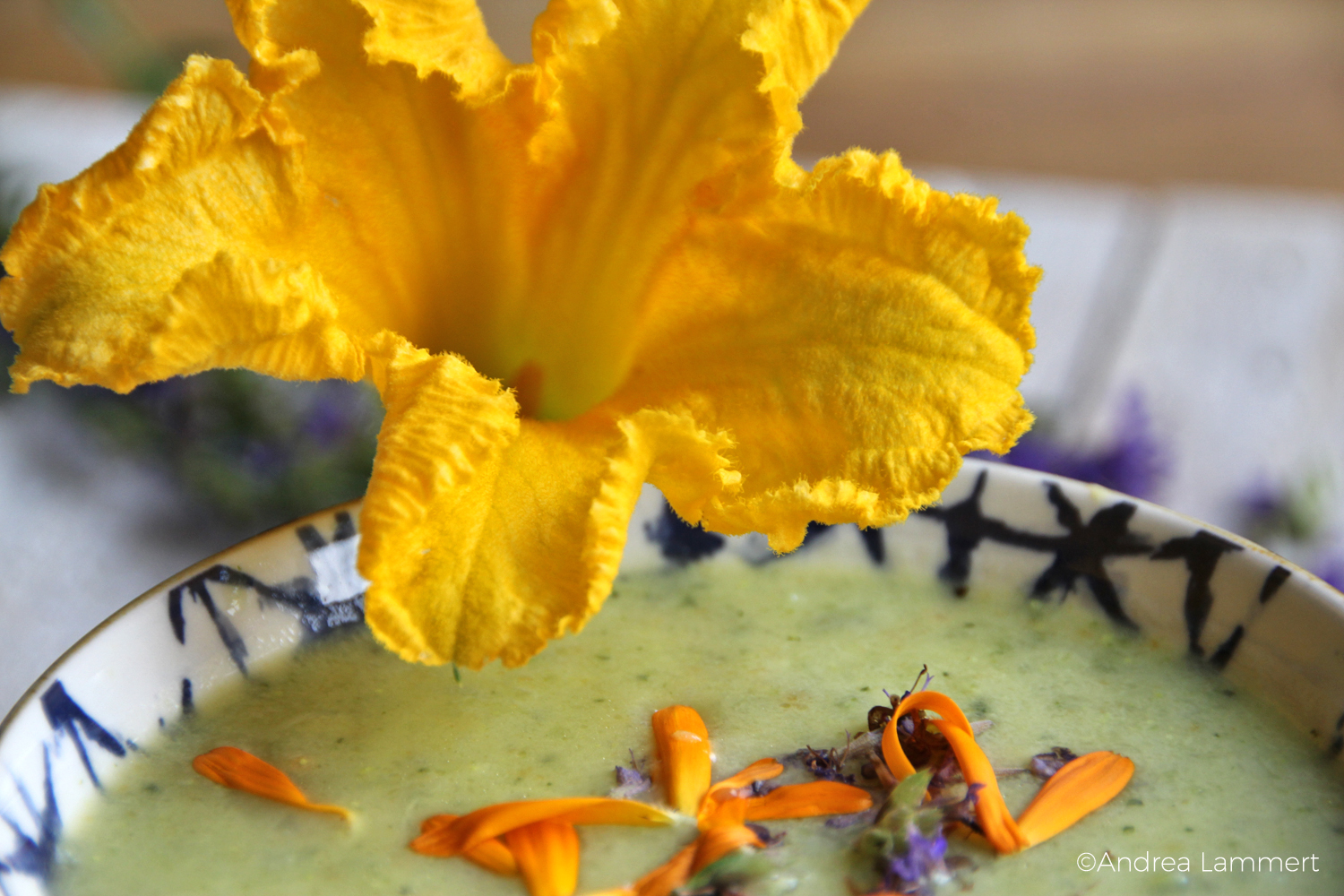 Übrigens: Dazu gab es bei mir Zucchiniblüten zum Einstippen in die Suppe. Habt Ihr mal gerochen, wie herrlich die duften? Ungewöhnlich intensiv, ich könnte sie glatt als Duftstrauß auf dem Schreibtsich haben. Und außerdem: Jede Blüte bringt weniger Zucchini an meinen Busch.