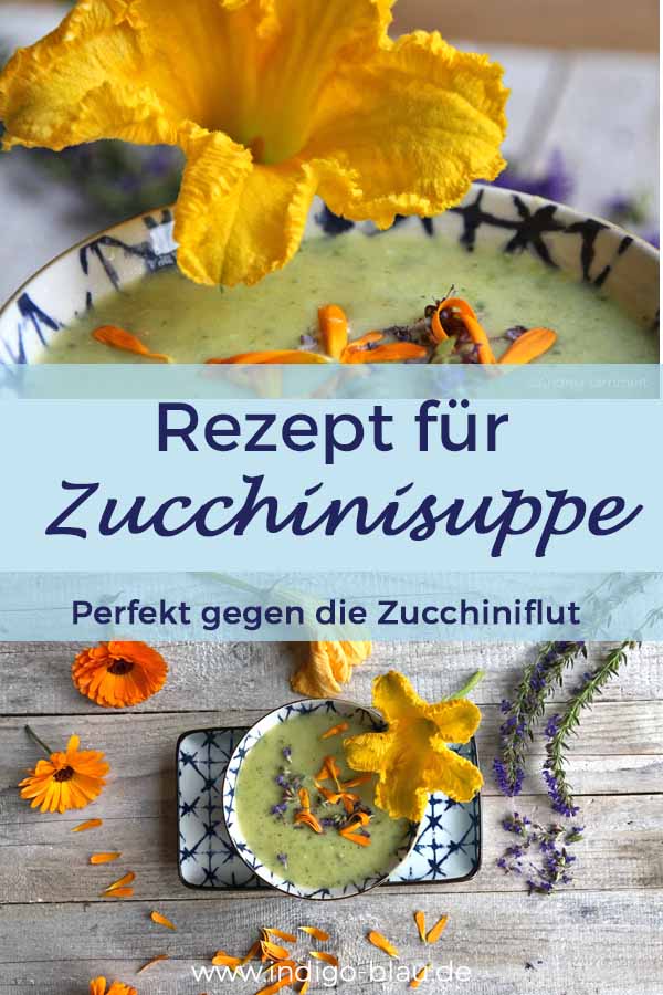 Die Zwiebeln und den Knoblauch würfeln, die Zucchini auch, alles in Olivenöl anbraten. Bald ablöschen und köcheln lassen, bis die Zucchini weich werden. Gemüsebrühe hinzugeben und pürieren. Wer mag, fügt noch einen guten Schuss besonderer Ölsorten hinzu, etwa Haselnuß oder Trüffel. Ich habe 2 EL gehackten Rosmarin hinzugefügt, das schmeckte toll und mit gezupften Ringenblumenblüten garniert. Wer es exotischer mag, lässt den Rosmarin weg und nimmt stattdessen Curry, Kurkuma und Cayennepfeffer. Oder versucht es mit anderen Gewürzmischungen, da sind kaum Grenzen gesetzt. Die Curry-Variante probier ich nächstes Mal aus. Ich habe ja viele Möglichkeiten zum Üben.