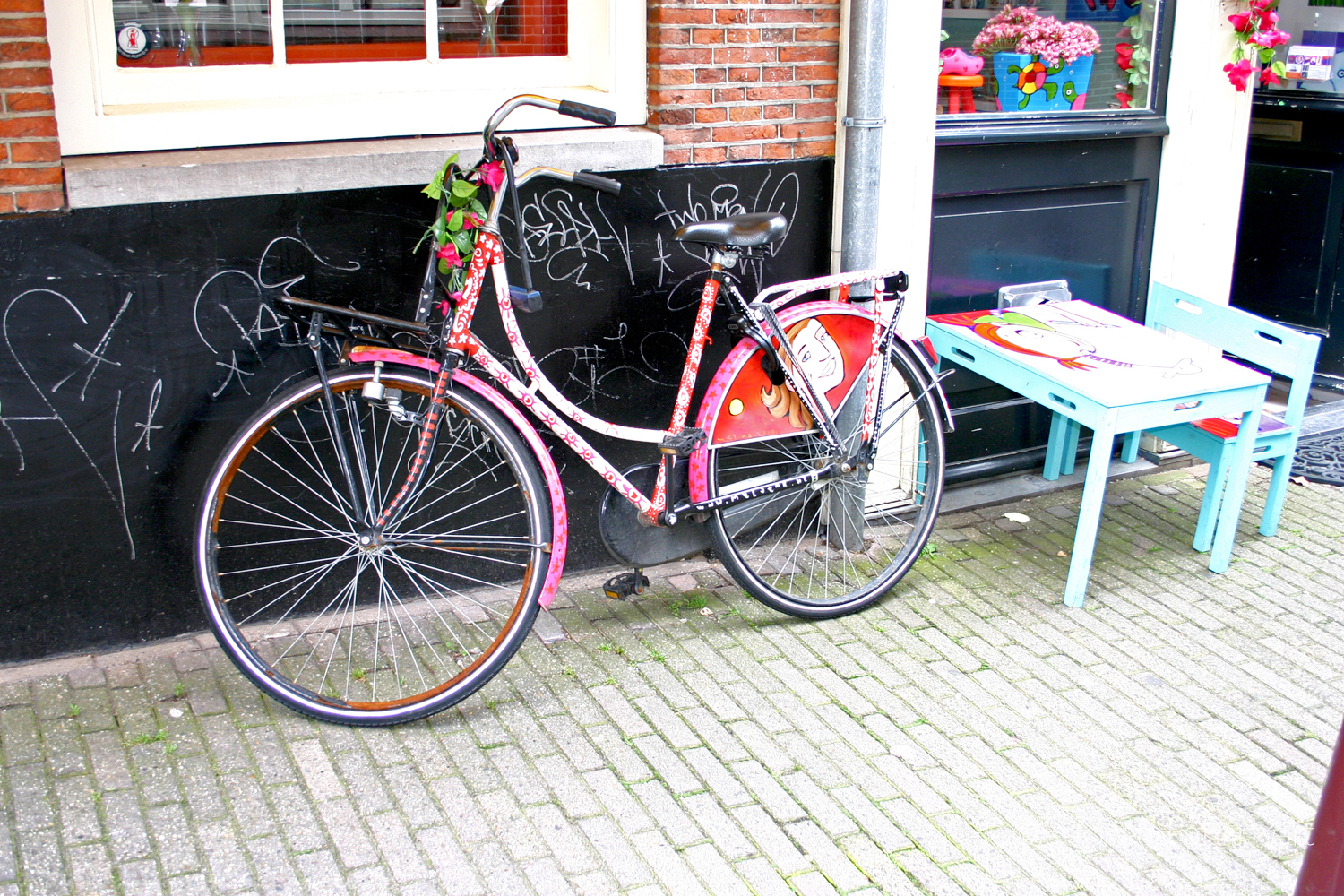 Erster Stopp: Bahnhof. Eine riesige Menge Fahrräder steht in einem Radparkhaus und glänzt in der Sonne. Wahnsinn, wie sollte ich hier denn mein Rad wiederfinden, wenn es mir im übersichtlichen Autoparkhaus schon Probleme macht, meinen PKW zu identifizieren? Ich schlendere mit der Masse Menschen über den Damrak hin zur Egelantiersgracht – ich habe Hunger und erinnere mich an ein wunderbares Café, in dem ich vor Jahren mit einer Freundin Pfannkuchen gegessen habe. T‘ smale Drinken heißt es, verbirgt sich wie die meisten Cafés in einem hübschen Backsteibgiebelhaus mit direktem Blick auf die Gracht. Viel besser als Warten auf dem Flughafen.